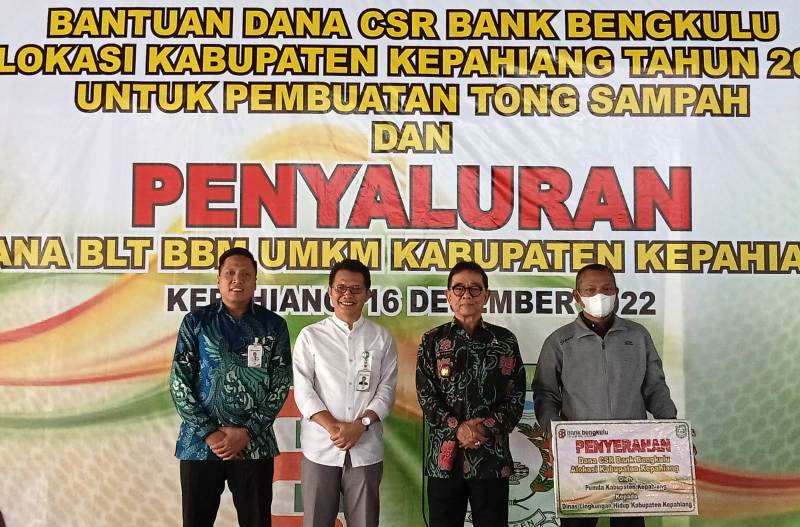 “Tahap pertama Rp100 juta diserahkan ke Pemkab Kepahiang, untuk pembuatan tong sampah. Sisanya Rp106 juta masih menunggu petunjuk kepala daerah,” terangnya kepada jurnalis di sela kegiatan penyerahan bantuan dana CSR Bank Bengkulu Alokasi Kabupaten Kepahiang tahun 2022 dan Penyaluran Dana BLT BBM UMKM Kepahiang di Gedung Wulandari Kepahiang.
