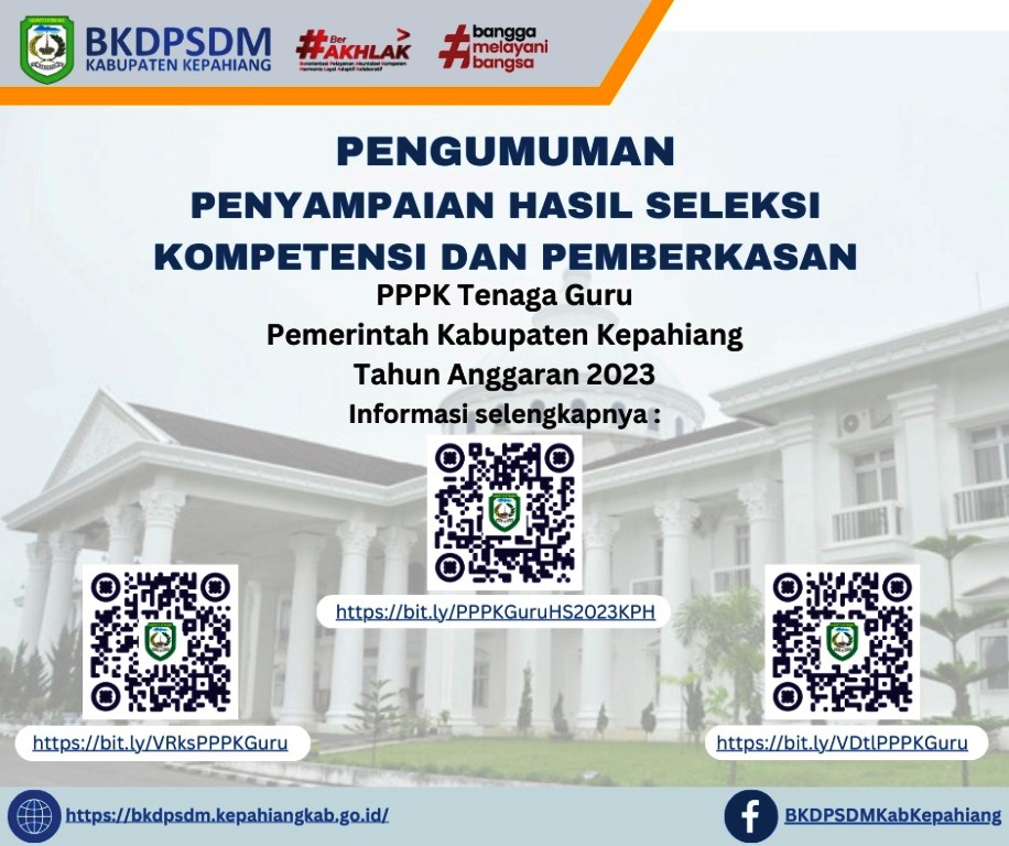 Pengumuman Penyampaian Hasil Seleksi Kompetensi dan Pemberkasan PPPK Guru Pemkab Kepahiang TA 2023 Bengkulu VoiceDesember 22, 2023Desember 28, 2023 Selengkapnya Pengumuman Klik Disini : Pengumuman PPPK Guru Hasil Seleksi 2023 . . Pos terkaitSosialisasikan Sigap Terpadu Anti Radikalisasi ke Kecamatan, Ini Penjelasan Musi DayanMonev Kegiatan Fisik Desa Pelangkian, Kades Sugandi Apresiasi InspektoratBerharap Jalan Cinta Mandi – Langgar Jaya Dapat Dibangun Pemprov BengkuluAplikasi DIPAYANG Dilaunching, Kelola Aset Jadi Lebih Cepat dan Transparan3 Hari Hanyut, Bocah 12 Tahun DitemukanOptimalisasi PBB-P2, BKD Gandeng Developer